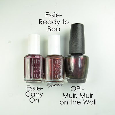 Maki Me Happy seemed very close to Gala-Vanting, but Gala-Vanting surprisingly has even more purple undertones when applied to the nail. MMH almost identical to the cult favorite OPI Magnala Wine. While they both have great formulas, they are different. I added Bahama Mama so you can see that all these polishes lean purple, but not as much as BM does.